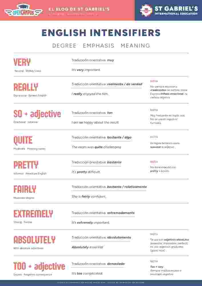 Palabras como very, really, so, quite, extremely o absolutely modifican adjetivos y adverbios para añadir énfasis. En el nivel B2, se espera que los estudiantes elijan los intensificadores de forma adecuada según el registro y la intención comunicativa.